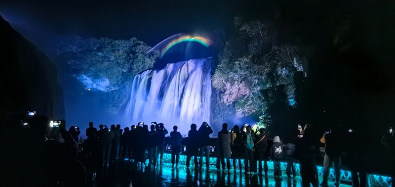 当暮色降临,夜游黄果树的精彩时段随之到来。白天气势磅礴的瀑布,在灯光技术的映衬下呈现出缤纷色彩,流水与光影相互交融,营造出如梦如幻的景象。“白天的瀑布令人震撼,夜晚的瀑布则更为浪漫!”来自贵阳的年轻游客小张与同伴在观景台留念,手机中已保存了许多光影佳作。